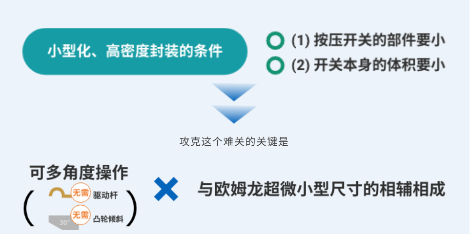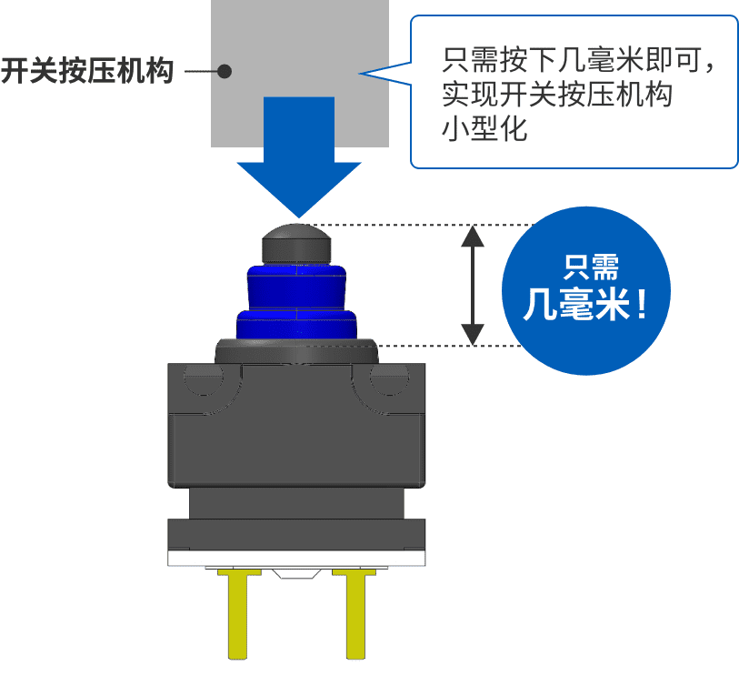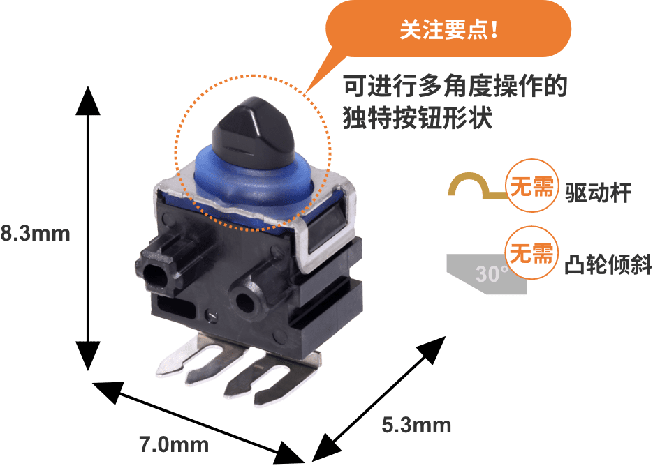 實(shí)現(xiàn)(1)和(2)最簡(jiǎn)單的方法就是從正上方按壓,也就是從行程(完全按下開(kāi)關(guān)的距離)最短的角度按壓。但要設(shè)計(jì)行程只有幾毫米的超微小型開(kāi)關(guān)的垂直按壓并不容易。